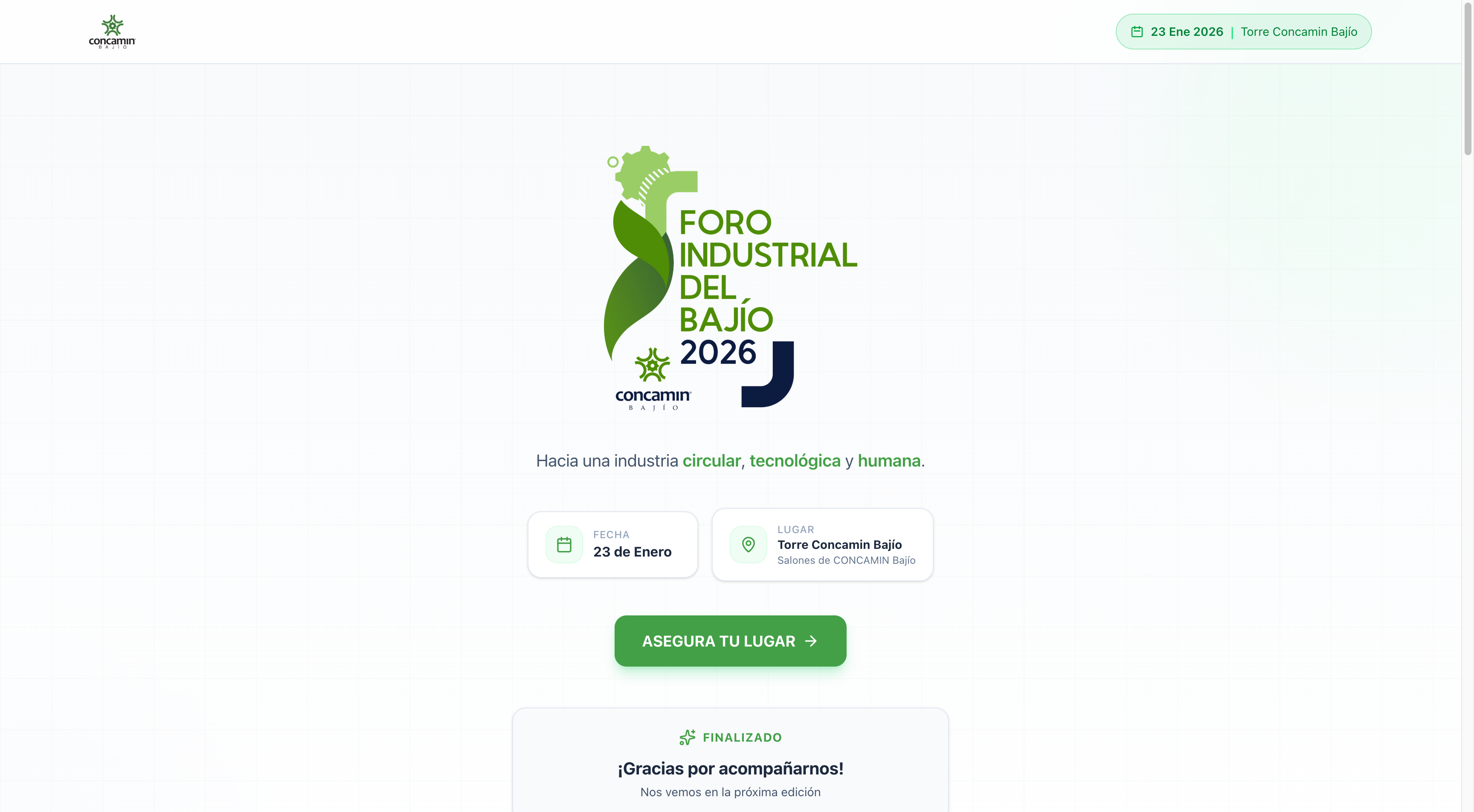 CONCAMIN Bajío necesitaba una plataforma profesional para gestionar el Foro Industrial del Bajío 2026, un evento de alto perfil con conferencistas reconocidos como Enrique Quintana y Carlos Elizondo, dirigido a líderes industriales de la región con registro controlado por folios institucionales.